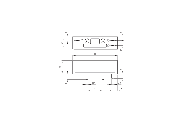 Flat plug-in connector 4.8 mm Non-contact principle 1 Reed contakts Long life Actuating surface and direction of actuation marked by switch symbol 85 mm x 26 mm x 24 mm Thermoplastic enclosure Actuating distance up to 55 mm depending on actuating magnet and version Spade connector