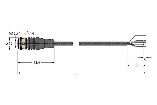 Actuator and Sensor Cable, PUR, Connection Cable, Voltage 250 V, Cable length 19 m, Female M12, straight, 4-pin, Shield on coupling nut/screw, Jacket material: PUR, shielded, Jacket color: black, Suitable for drag chain use, Resistant to chemicals, UV radiation and oils, Flame retardant (FT2 acc. to UL 1581, IEC 60332-2-2), Resistant to welding sparks, Free from halogen, silicone, PVC and LABS, Particularly resistant to abrasion, Protection class: IP67, IP69K, Cable length: 19 m