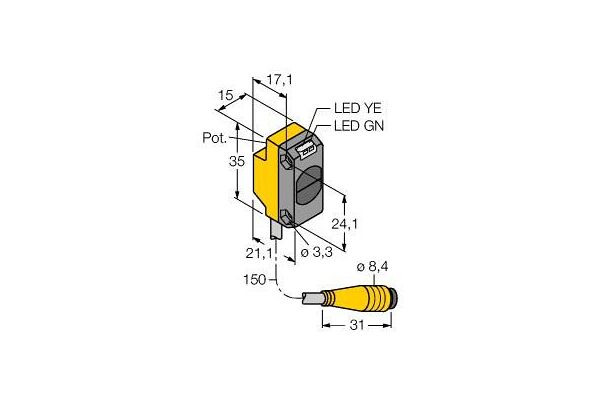 Photoelectric Sensor, Diffuse Mode Sensor, Operating voltage 10…30 VDC, Max. range 100 mm, Cable length 0.15 m, Cable with male end, 4-pin, PVC, 150 mm, 8 mm, Protection class IP67, LED all-round visible, Sensitivity adjusted via potentiometer, Operating voltage: 10…30 VDC, PNP switching output, changeover