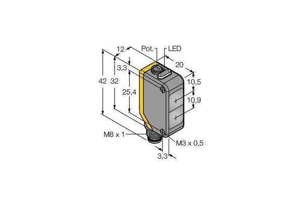 Photoelectric Sensor, Diffuse-Mode Sensor, Operating voltage 10…30 VDC, Max. range 250 mm, Male M8 × 1; 4-pin, Protection class IP67, LED, all-round visible, Sensitivity adjusted via potentiometer, Operating voltage: 10…30 VDC, NPN switching output, changeover