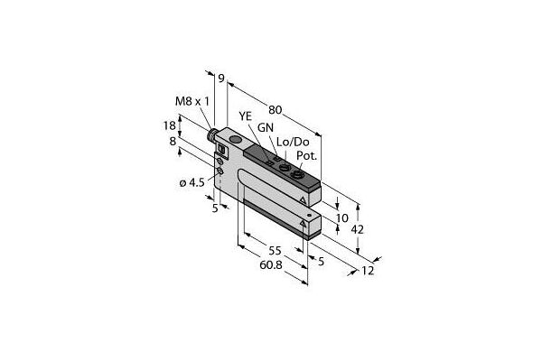 Photoelectric Sensor, Bifurcated Retroreflective Sensor, Operating voltage 10…30 VDC, Max. range 10 mm, Male, M8 × 1, Protection class IP67, Sensitivity adjusted via potentiometer, Operating voltage: 10…30 VDC, PNP switching output, light or dark operation
