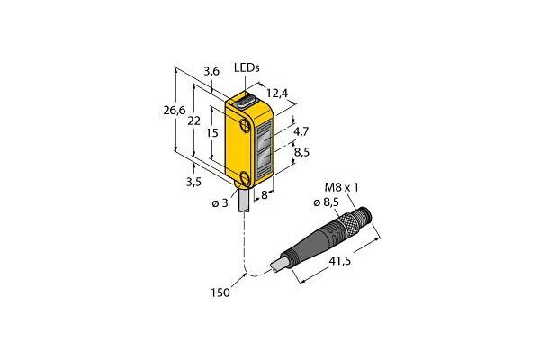 Photoelectric Sensor, Retroreflective Sensor, Miniature Sensor, Operating voltage 10…30 VDC, Max. range 1500 mm, Cable length 0.15 m, Cable, PVC, 150 mm, with M8 × 1 male end, 3-pin, Protection class IP67, LED all-round visible, Indication of insufficient excess gain, Operating voltage: 10…30 VDC, NPN switching output, dark operation