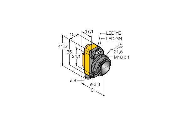 Photoelectric Sensor, Retroreflective Laser Sensor with Polarizing Filter, Operating voltage 10…30 VDC, Max. range 10000 mm, Male connector, M8 × 1, 4-pin, Protection class IP67, LED, all-round visible, Sensitivity adjusted via potentiometer, Microprism reflector BRT-51X51BM recommended for ranges up to 10 m and self-adhesive reflector film BRT-TVHG-2X2 for ranges up to 1.5 m; included in scope of delivery, Operating voltage: 10…30 VDC, PNP switching output, changeover