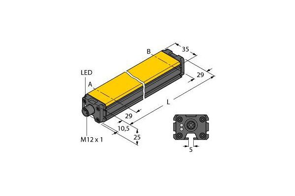 Inductive Linear Position Sensor, Operating voltage 15…30 VDC, Measuring range 400 mm, Rectangular, aluminium / plastic, Versatile mounting possibilities, LED indicates measuring range, Immune to electromagnetic interference, Extremely short blind zones, Resolution, 12-bit, 4‐wire, 15…30 VDC, Analog output, Programmable measuring range, 0…10 V and 4…20 mA, M12 × 1 male, 5-pin